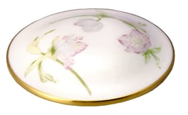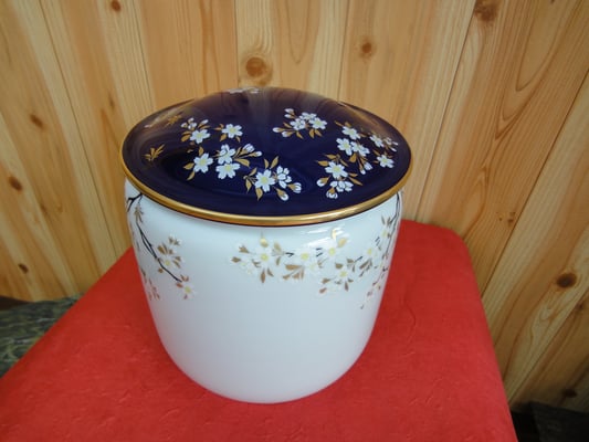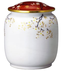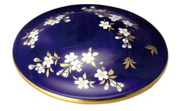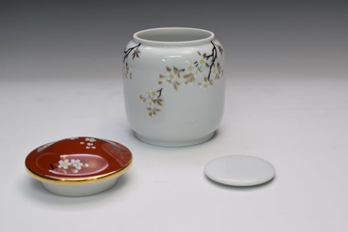 古来より『さくら』は日本人にとって特別の感情を抱く心の花と言えます。満開のさくらの風情を有田独自の白色の「盛り絵具」と金彩で描いています。蓋と水抜き盤は深く神秘的な瑠璃色に染め、本体は透明感のある白磁として、艶やかな桜を引き立てています。桜の白い花は盛り絵具で描かれています。