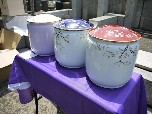 実際の墓地にてお骨壺からお骨を取り出し、やすらぎの壺へ移し替えました。当日は大変暑い中でしたがご家族皆様で移し替えをやっていただきました。お施主様はお骨壺内に溜まる結露を気になさっており、「これで冷たくなくてすむね」とおっしゃっていたのが印象的でした。