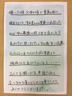 遺されたものの自己満足かもしれませんが、奇麗なお骨壺を故人へ贈れてよかったです。