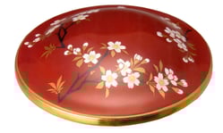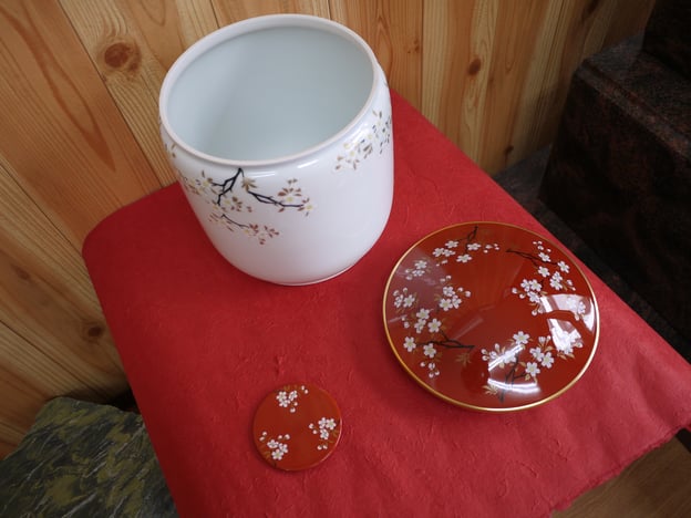 古来より、朱色は高貴な色として「邪気を祓う」と云われています。蓋と水抜き盤を深川独自の艶やかな朱色で彩色し、日本人の心の花さくらを全体に配しております。盛り絵具の白い花びらは朱色に映えます。