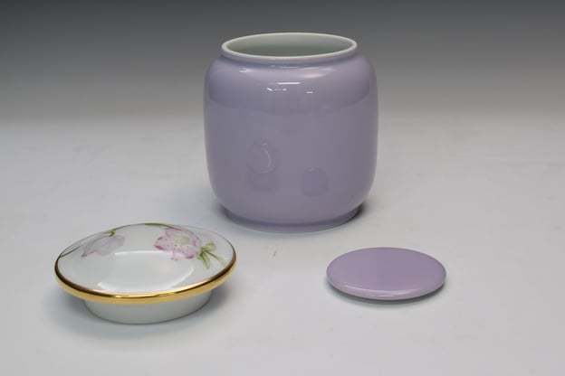 この深川製磁のお骨壺の乳白色の有田焼の色味に深川ブルー、朱、紫が合わさったお骨壺を見てこれだと思いました。