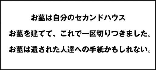 上記のコメントは実際に弊社でお墓を建てられた方から頂いた言葉です。お墓のプロである私達も予想ができない言葉をお客様からいただくことがあります。それはその方々の“人生の表現”なのだと思います。死後の第二の住まいという考えや人生の再スタート、お墓は亡くなった方から自分達へのメッセージ。