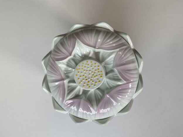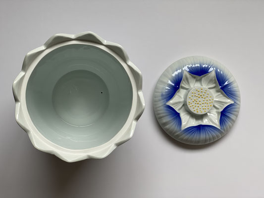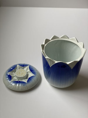 一个美丽的莲花形状的瓮。 在有田制造,以其精美的日本陶瓷而闻名。