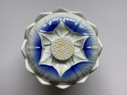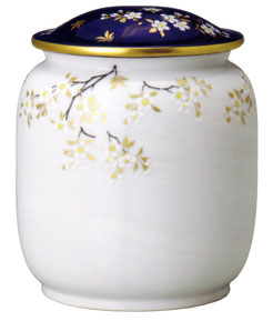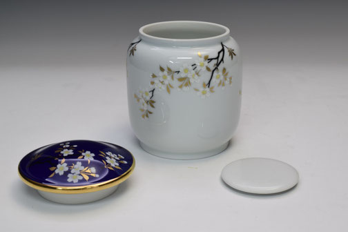 古来より『さくら』は日本人にとって特別の感情を抱く心の花と言えます。満開のさくらの風情を有田独自の白色の「盛り絵具」と金彩で描いています。蓋と水抜き盤は深く神秘的な瑠璃色に染め、本体は透明感のある白磁として、艶やかな桜を引き立てています。桜の白い花は盛り絵具で描かれています。