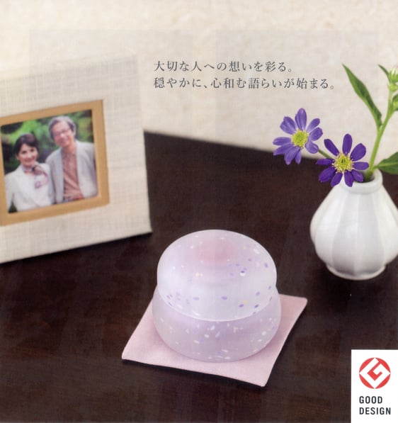 ガラス素材は蓋を締めても室内の光が優しく納骨部分まで届きます。光が差し込むことにより内部に施された色ガラスが発色。やさしい色と光の世界が最愛の人を包み込みます。