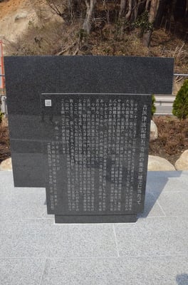 | 「吉浜の人々と歴史」を象徴的なかたちに捉え、意図したデザインです。それは、「二人の村長の教え」を支えの台形の石に例え、そしてその上にバランスを保ちながら置かれた二つのL字型の石を「吉浜の人々」と「歴史」に例えてデザインした「石のかたち」です。 |