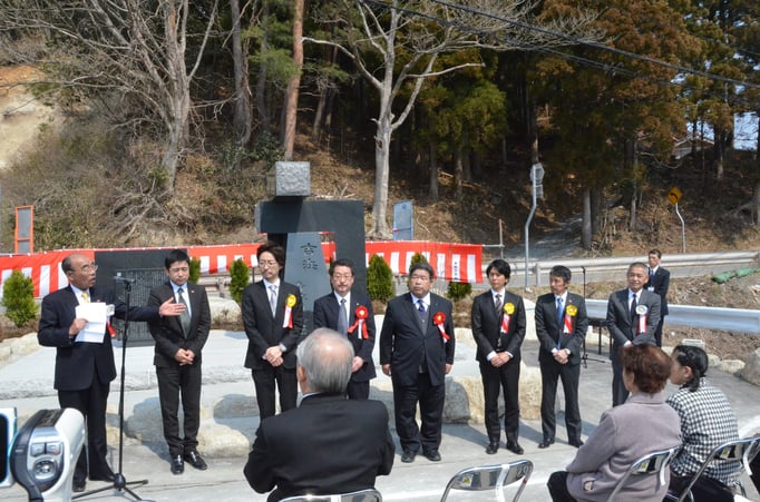 「震災から3年が経ちこの除幕式の時に印象深いと感じたのが紅白幕でした。震災1年目で建立した第1号基目の除幕式では幕はなかったと思います。その余裕も皆にはなかったし、まして紅白なんかはおかしいという気持ちがあったためです。幕の色1つとっても住民の方々の意識が今どのようになっているのかが見て取れます。1つ前に建立された綾里駅前にある津波記憶石の時も、この吉浜の時も紅白幕だった。印象深い光景です。除幕式後、吉浜の方々が昼食会を開いてくださり、僕は取り付けてあるQRコードの説明をさせていただきました。震災の状況やデータなどを石碑を見に来た方々がスマートフォンなどで読み取るためです。その後、吉浜中学校の生徒さんによる復興にかける思いの作文朗読、合唱で「花は咲く」を歌っていただきました。この歌は今でも毎年3月11日に震災を忘れないために歌われているそうです。参加した全優石のメンバーも僕も涙を流し聞いていたのを覚えています。2人の村長さんの高台移転によって被害が圧倒的に少なく奇跡の集落と呼ばれた吉浜はこの震災を語る上で非常に重要な地域と言えます。我々はこの津波記憶石が震災の事実、教訓を後世へ遺す手助けとなれば幸いです。」