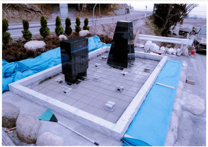 様々な関係各所の調整を行い除幕式の日程が決まった。それにともない自動的に施工完了期日も決まる。字彫りを石玉石材さんで完了した津波記憶石は陸路で吉浜まで送られた。最後の据え付けを担当する岩手県下閉伊郡山田町 伊藤石材工業さんには、日程が厳しい中での工事に大変な努力をしていただいた。
