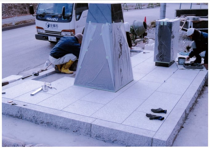 「吉浜での津波記憶石の製作に協力していただいた水野社長を訪ねるため岐阜県多治見市へ向かいました。ご支援に対して電話でのご挨拶ではなく、実際にお会いして感謝の気持ちを示したかったからです。また、石玉石材さんに伺ったのは、髙橋先生のデザイン案から図面を起こしたものがすでに製品となって完成していました。字彫りを石玉石材さんで彫刻していただけるとのことでしたので実際に見に行き彫刻する場所のバランスや文字を彫る深さなどの最終調整をしたかったためです。打ち合わせが終わった後、今の石材業界の話や水野さんが陸前高田市と親交があり、復興に協力したい旨など様々なことを話しているうちに二時間くらいはあっという間に過ぎてしまいました。」